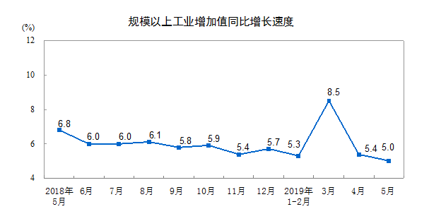 根据数据报告统计,2019年5月份规模以上工业增加值同比实际增长5.0%(以下增加值增速均为扣除价格因素的实际增长率),和上个月相比回落0.4个百分点。