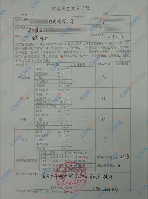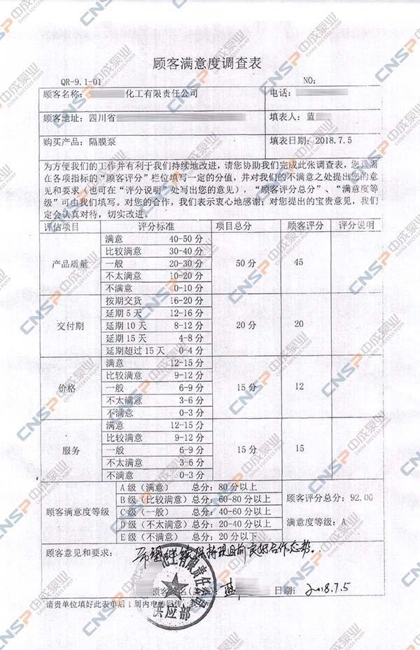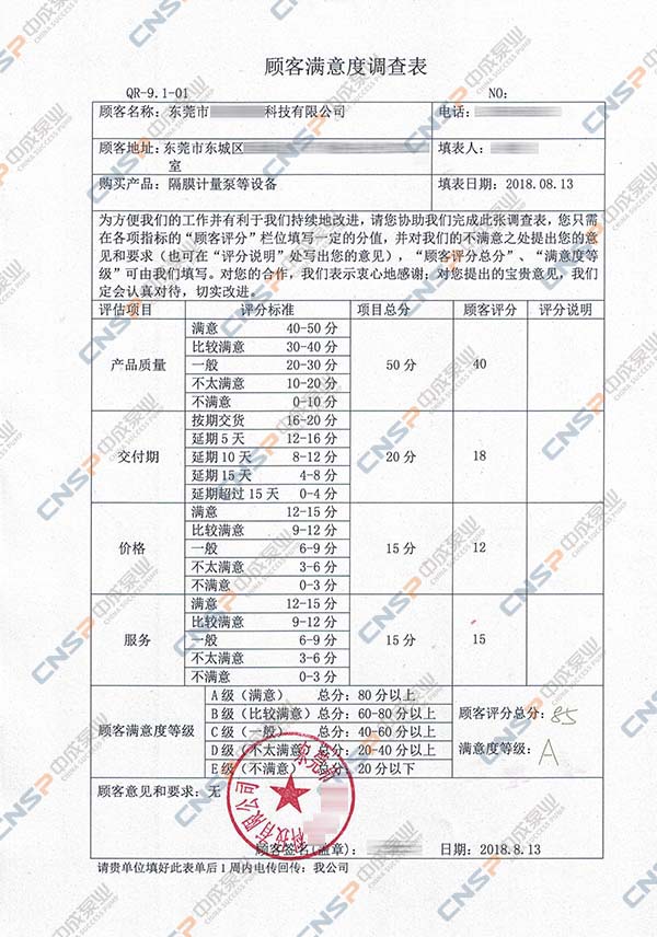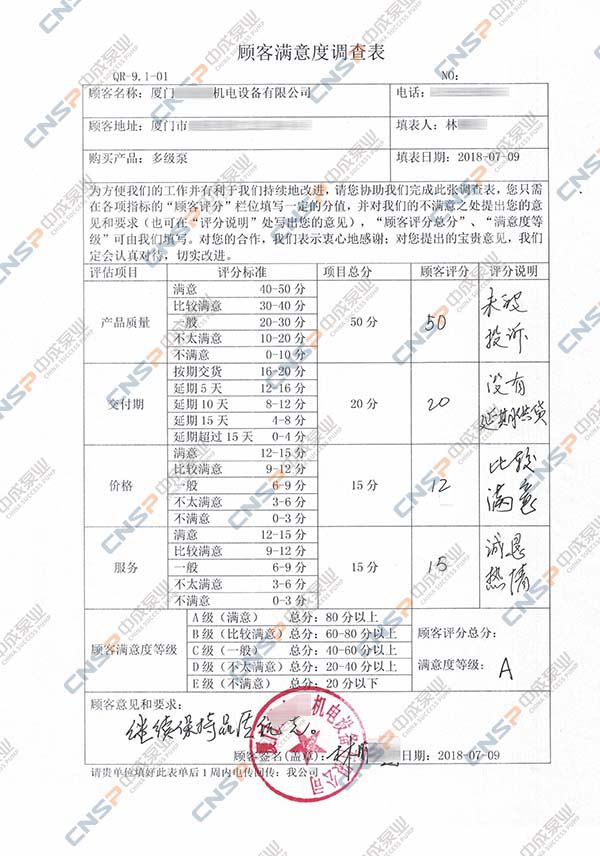 中成泵业从我们的多级泵、计量泵等产品的客户中抽选几名进行表格内容调查,客户反馈成绩均为A级,其中螺杆泵、磁力泵、隔膜泵等客户纷纷表示希望保持合作并对我们的产品持有期望。